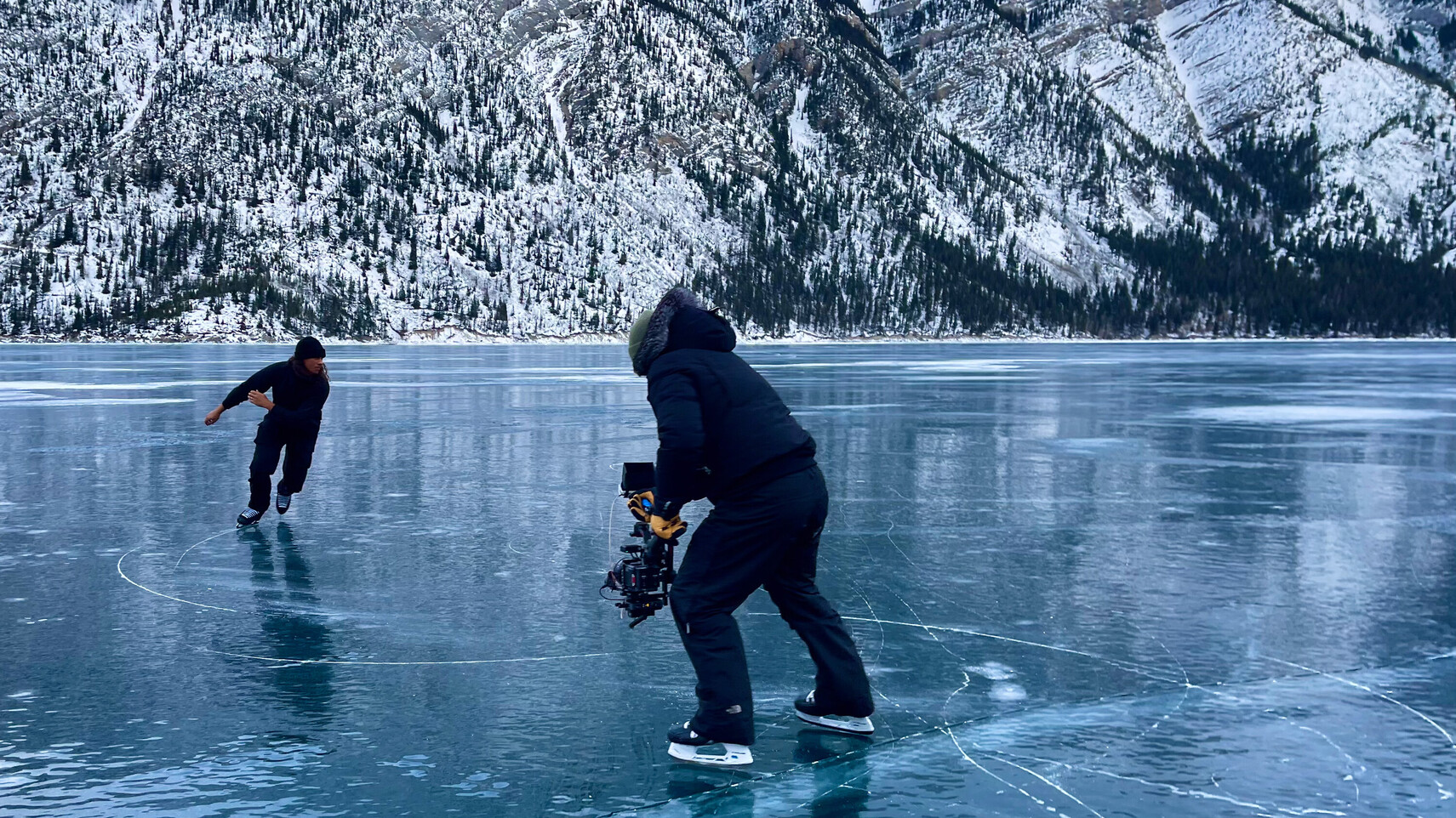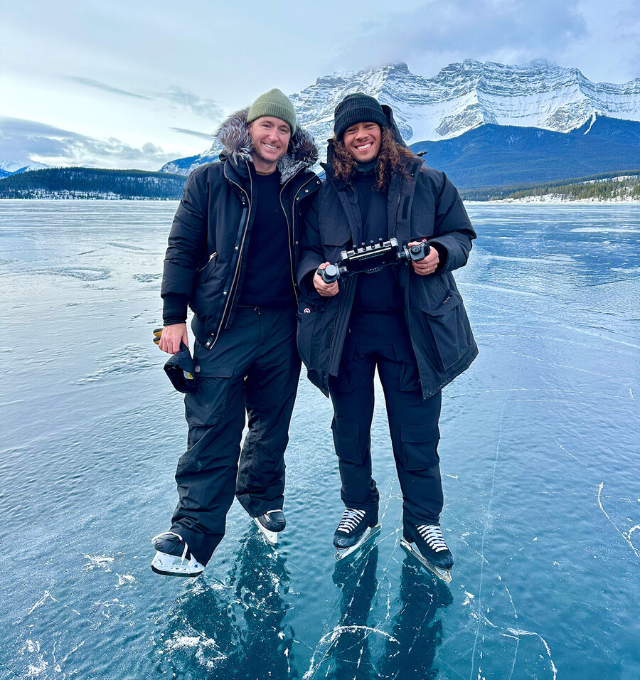 Filmmaker Mike Schwartz and Elladj Baldé on set at Lake Minnewanka. Luckily Mike used to be a hockey player. He was able to follow Elladj swiftly on the ice and capture stunning images with his camera.